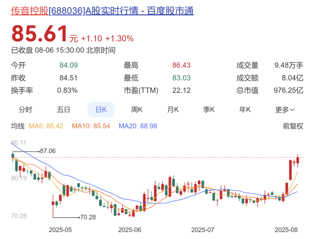 截至8月6日收盘,传音控股股价报85.61元,总市值976.25亿元。